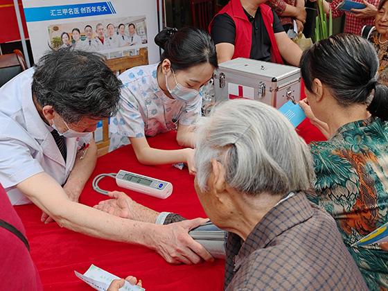 从上午九点开始,医院医护团队运用便携式检测设备为往来居民提供血压、血糖检测,结合数值变化给予针对性的健康提醒。同时根据老年群体常见的代谢问题,以通俗易懂的方式讲解日常养护要点,并科普消化道常见疾病预防知识。